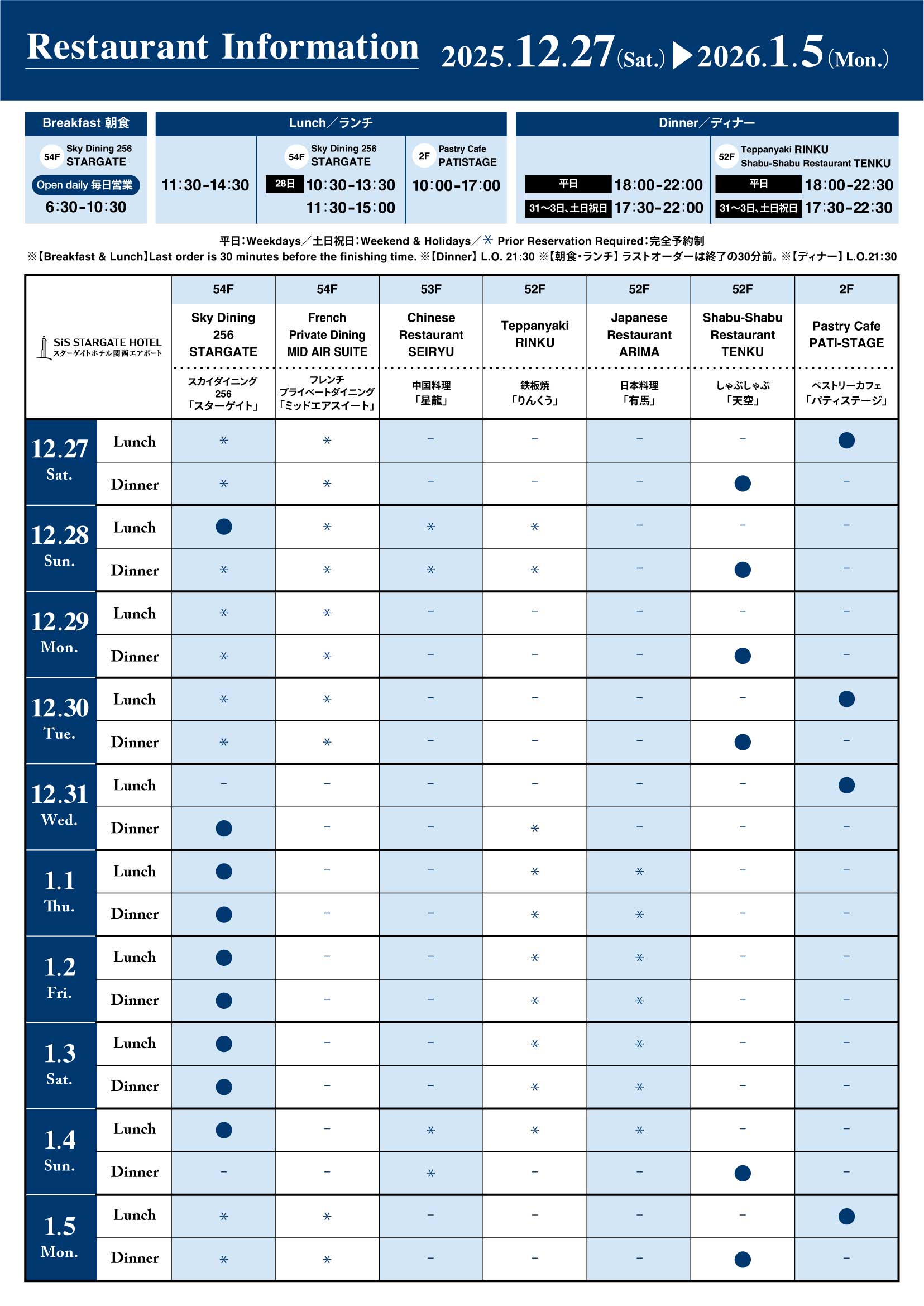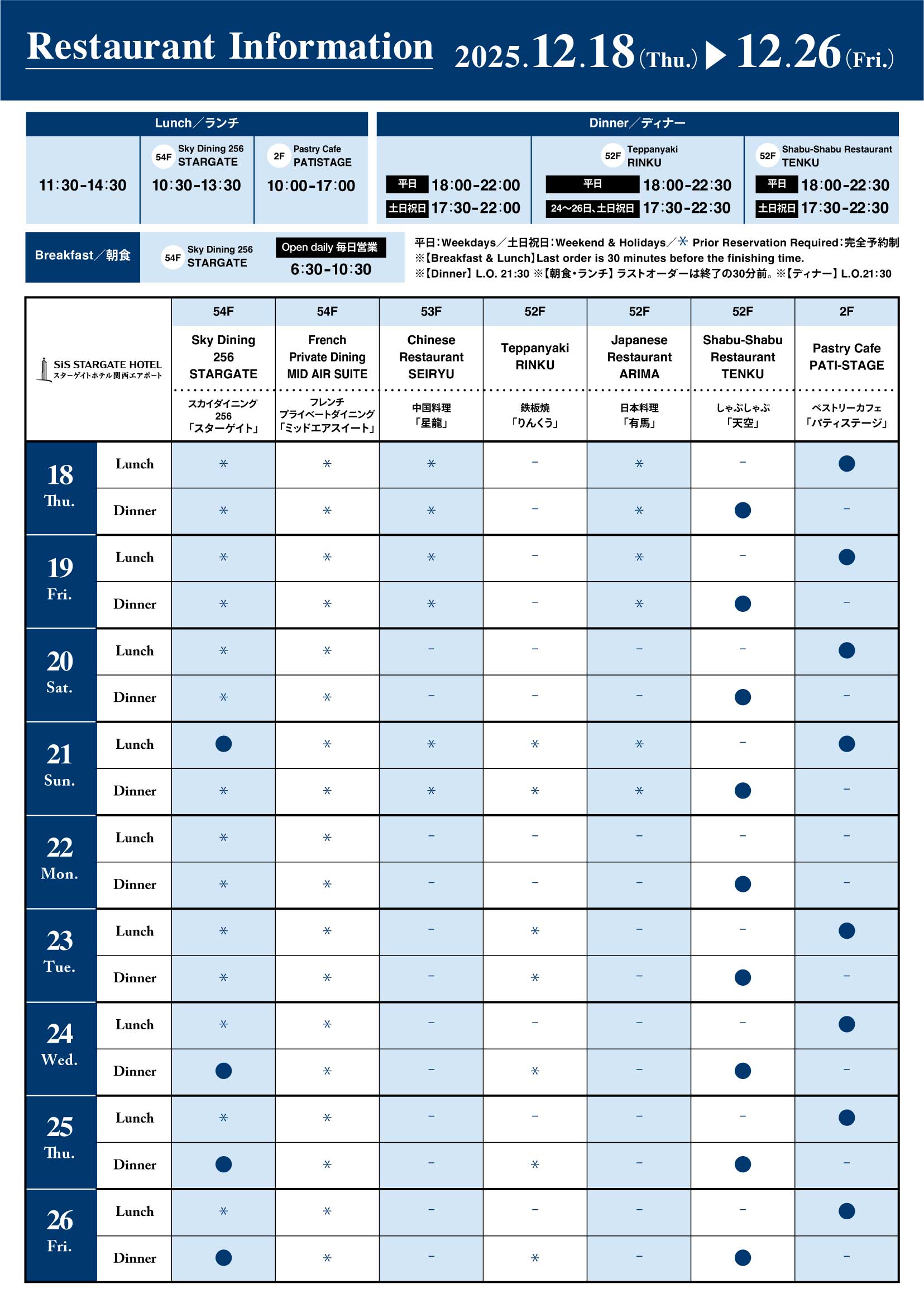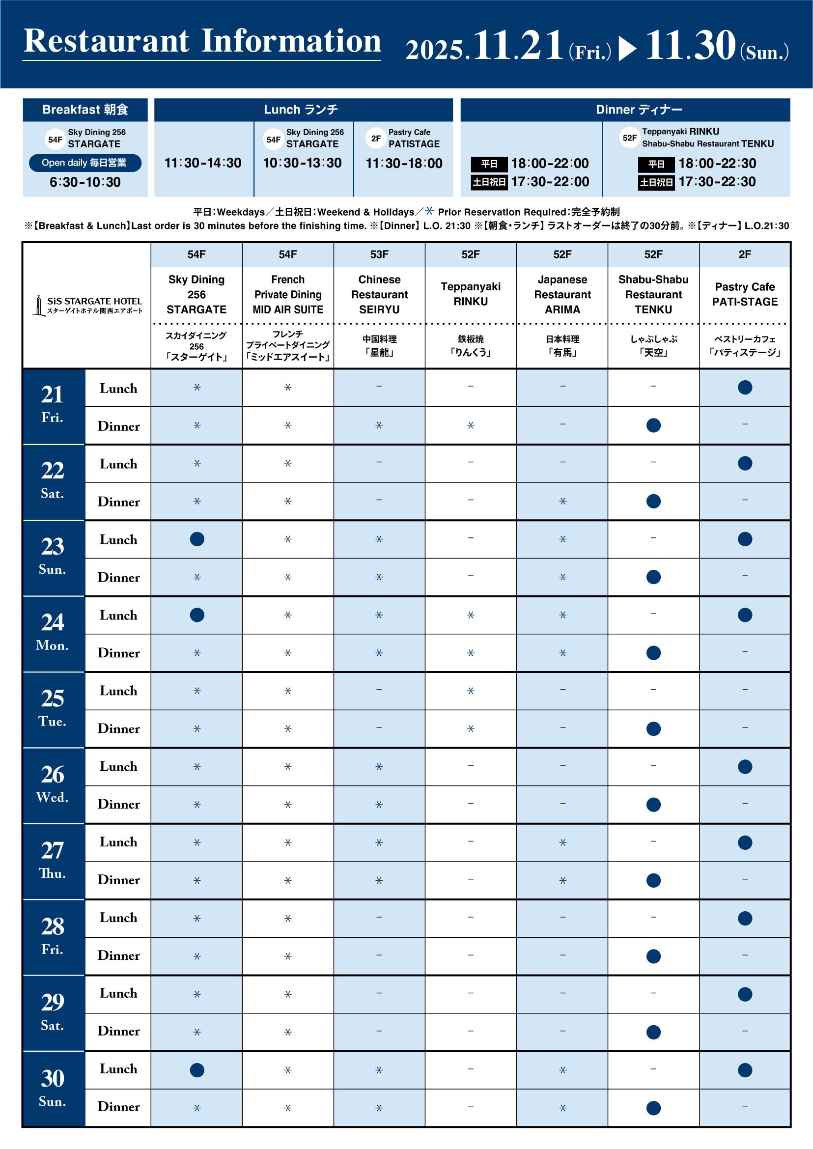 【スターゲイトホテル関西エアポート】レストラン営業内容について