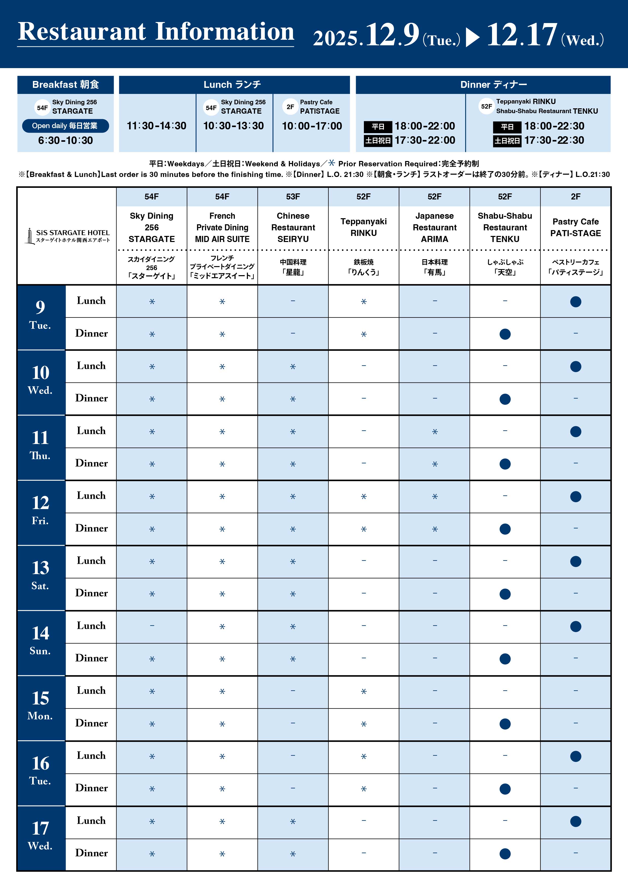 【スターゲイトホテル関西エアポート】レストラン営業内容について